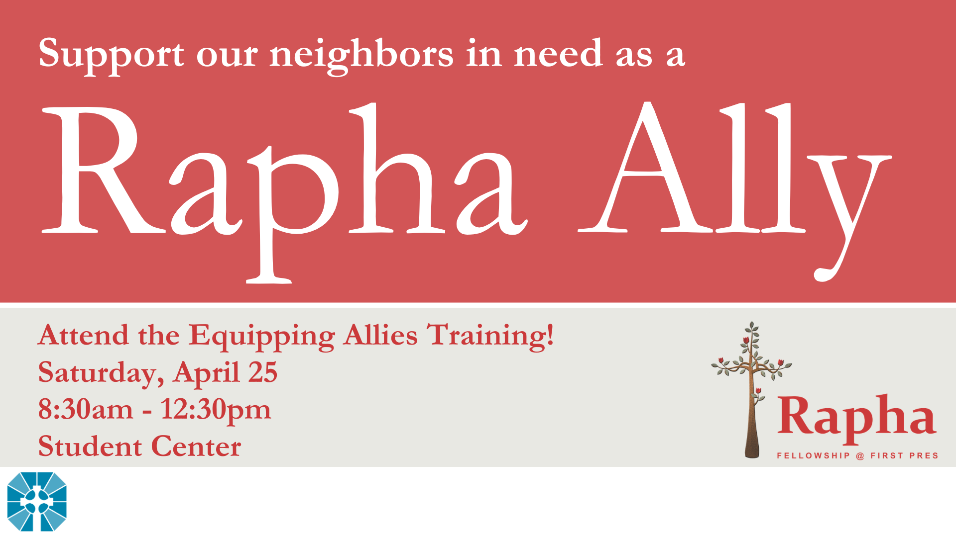 We are launching a new volunteer-based initiative to support our Rapha Ministry: Rapha Allies. As an Ally, you will add to our Rapha participants’ support system by attending either the Faith & Finance, Faith & Works, or Faith & Relationships class on Wednesday evenings and following up regularly with participants to offer advice and encouragement. If you’re interested, consider attending our Equipping Allies Class on Saturday, April 25, at 8:30am in the Student Center (register below), or email Director of Community Outreach Shad Guinn, Shad@1stPresbyterian.com.