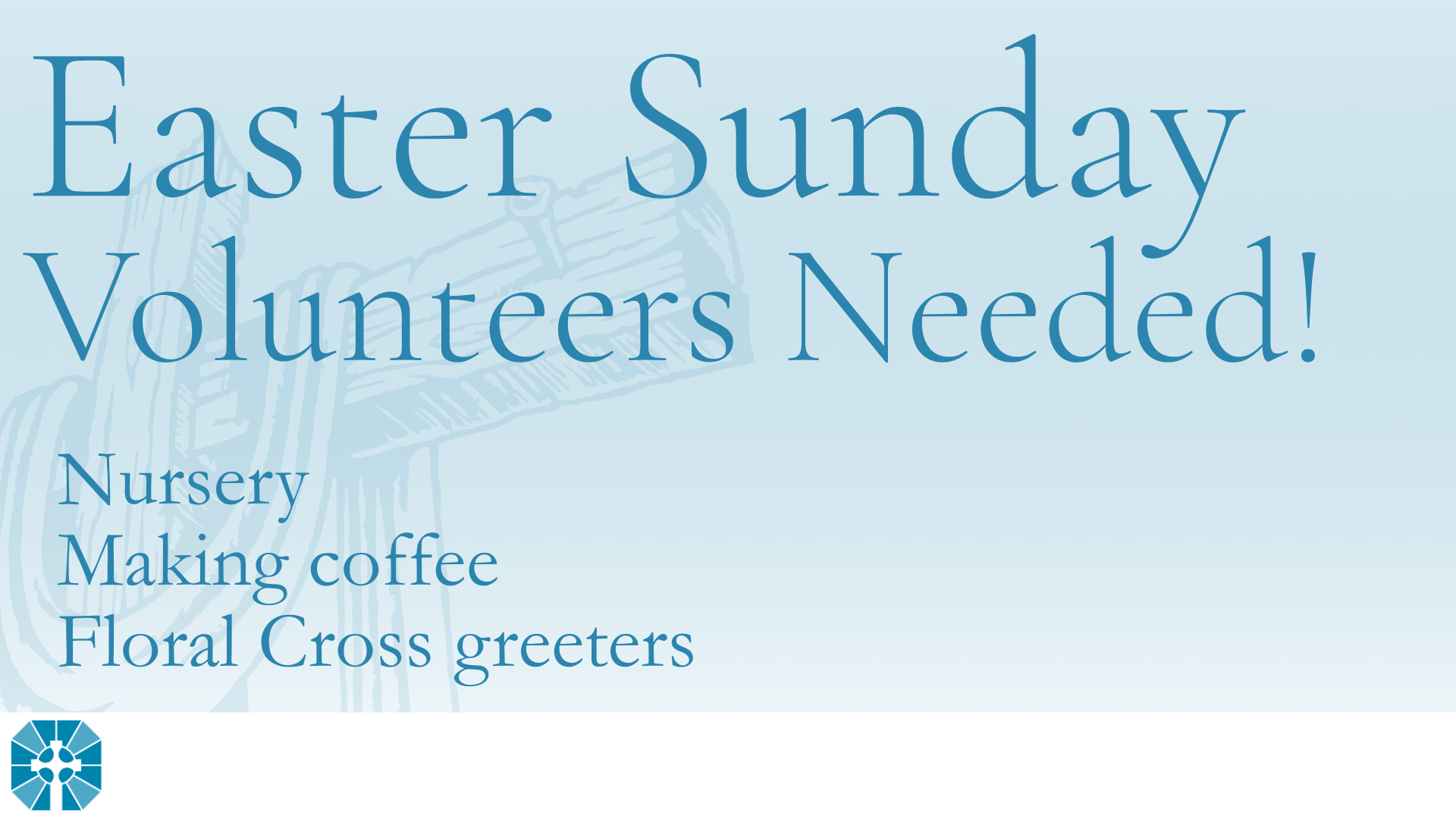We’re expecting lots of visitors this Easter, and we need volunteers to help ensure the morning runs smoothly by greeting people at the floral cross, making coffee, and helping in the nursery. If you’re willing and able, sign-up below!