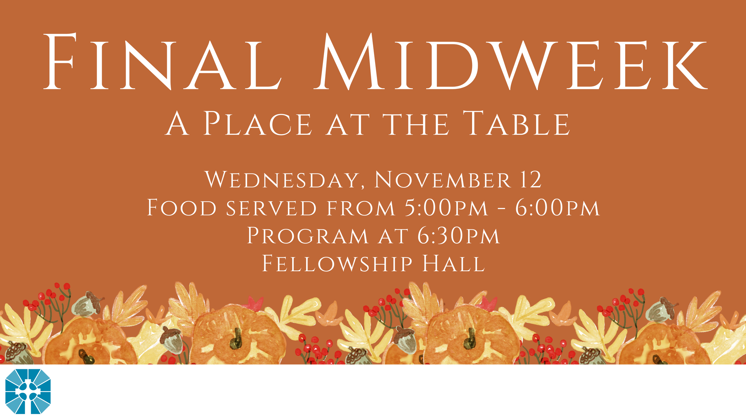Take a break from your usual weeknight routine and join us each Wednesday for a refreshing evening of fellowship and spiritual formation! Families and friends will gather for dinner in the Fellowship Hall starting at 5:30pm, and electives for all ages start at 6:15pm. Electives include Children's Ministry and Children’s Choir (Nursery-5th Grade), Middle School Small Group*, High School serve opportunities, Adult Elective classes, Adult Choir, and Rapha Fellowship. Please register your child(ren) for their Midweek elective this semester (link below).