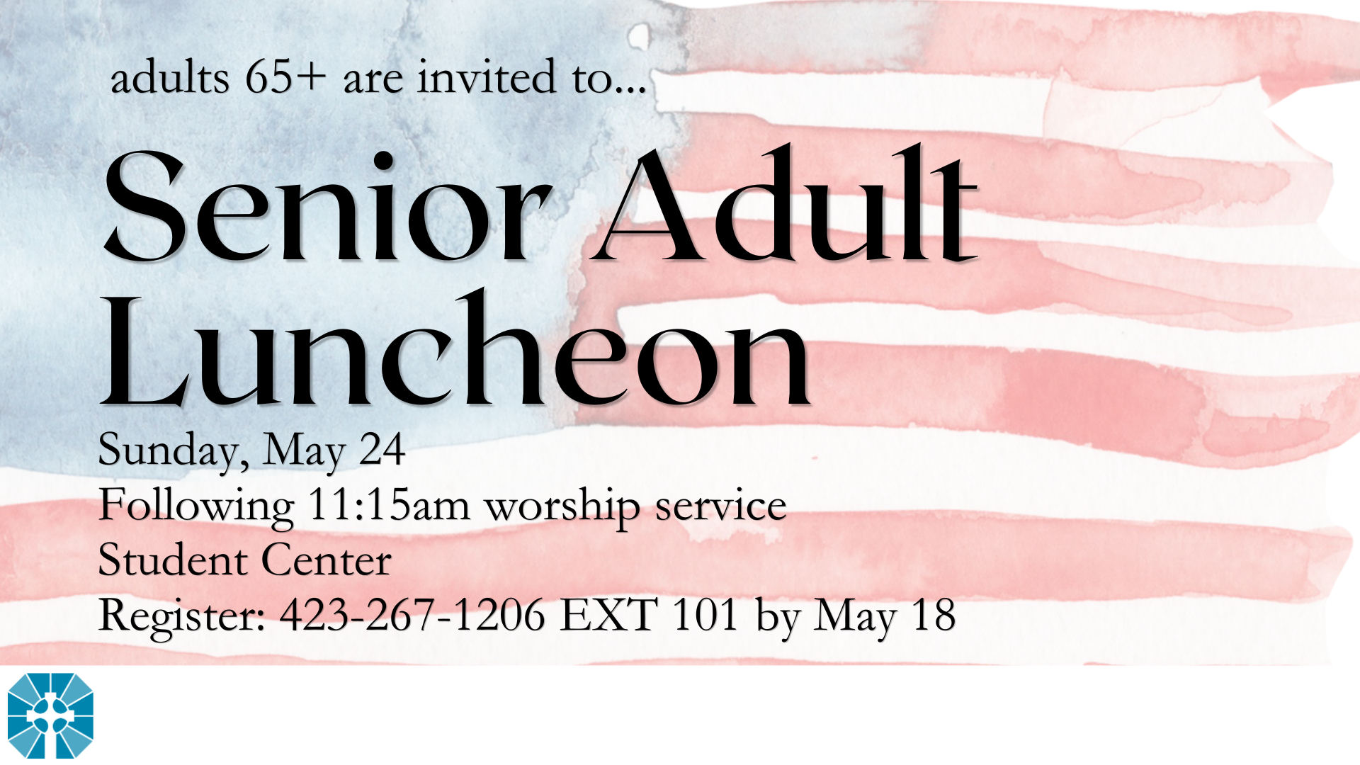 Adults 65+ are invited to our annual Senior Adult Luncheon on Sunday, May 24, immediately following the 11:15am worship service in the Student Center! Please call the church office at 423-267-1206 ext 101 by Monday, May 18, to register.