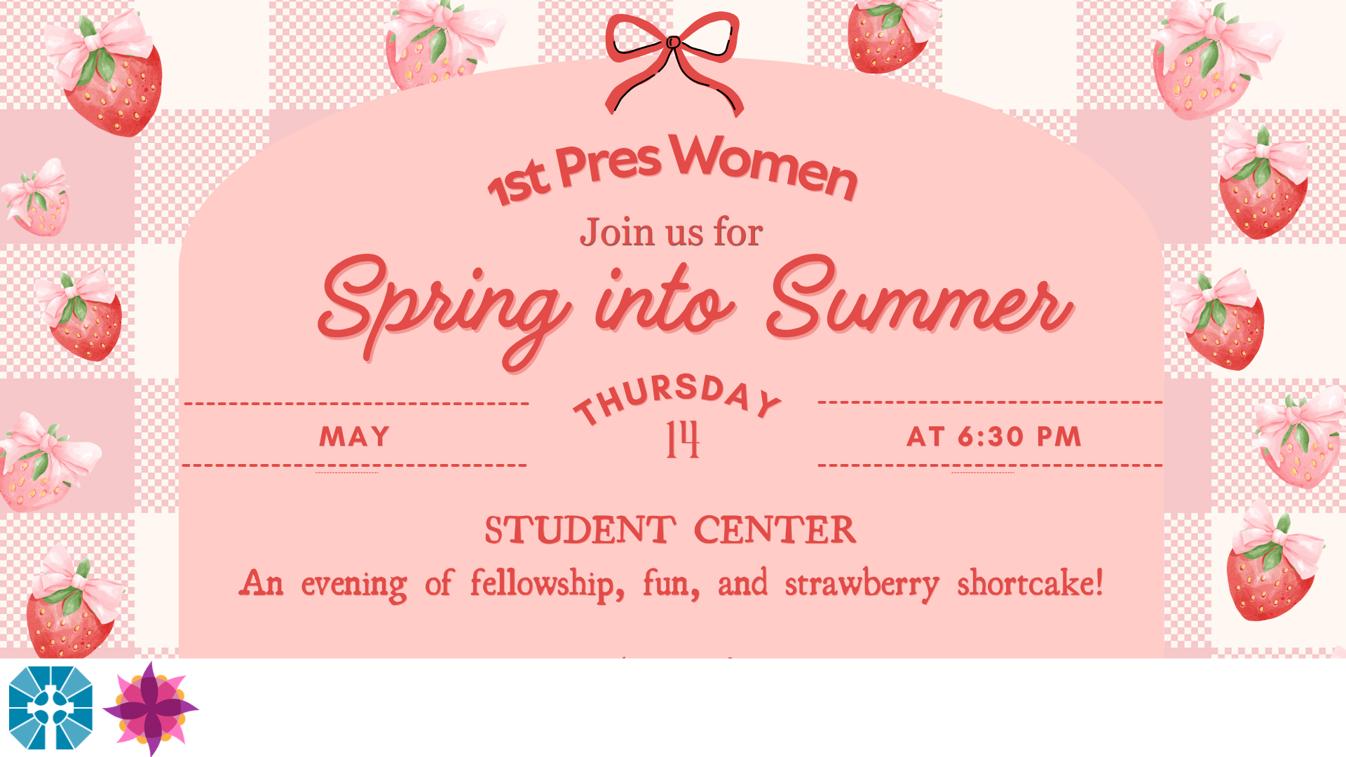 1st Pres women, please join us (and bring a friend) as we gather on Thursday, May 14, at 6:30pm in the Student Center for a fun event to kick-off summer! We’ll have a time to fellowship and connect with each other, learn about summer activities, get some great ideas on hospitality, and enjoy some delicious strawberry shortcake.