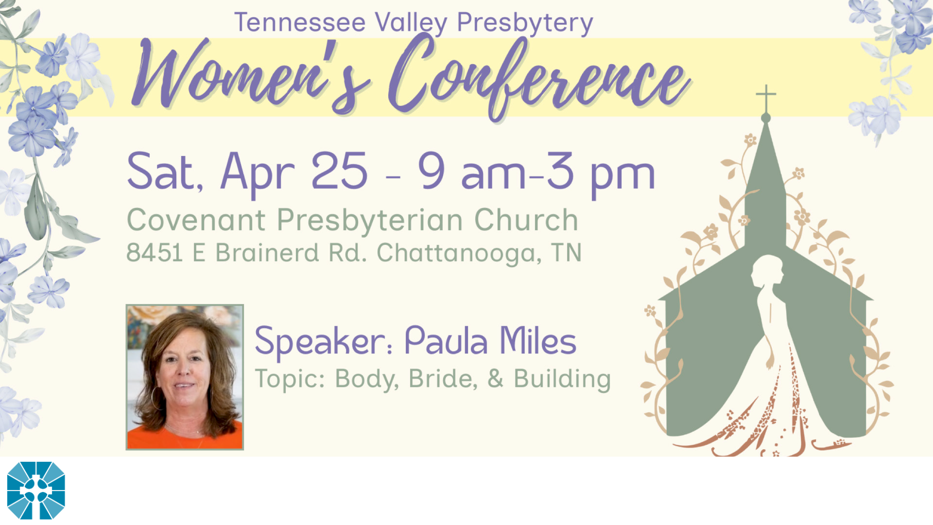 Join us in exploring God’s enduring vision for a holy, chosen, and dearly loved people. Together with this year’s keynote, Paula Miles (Women’s Ministry Director at Clemson Presbyterian Church), we will reflect on the beauty and purpose of a body with many members, a bride being prepared for her bridegroom, and a building formed from living stones, discovering our shared identity and calling in God’s redemptive story.