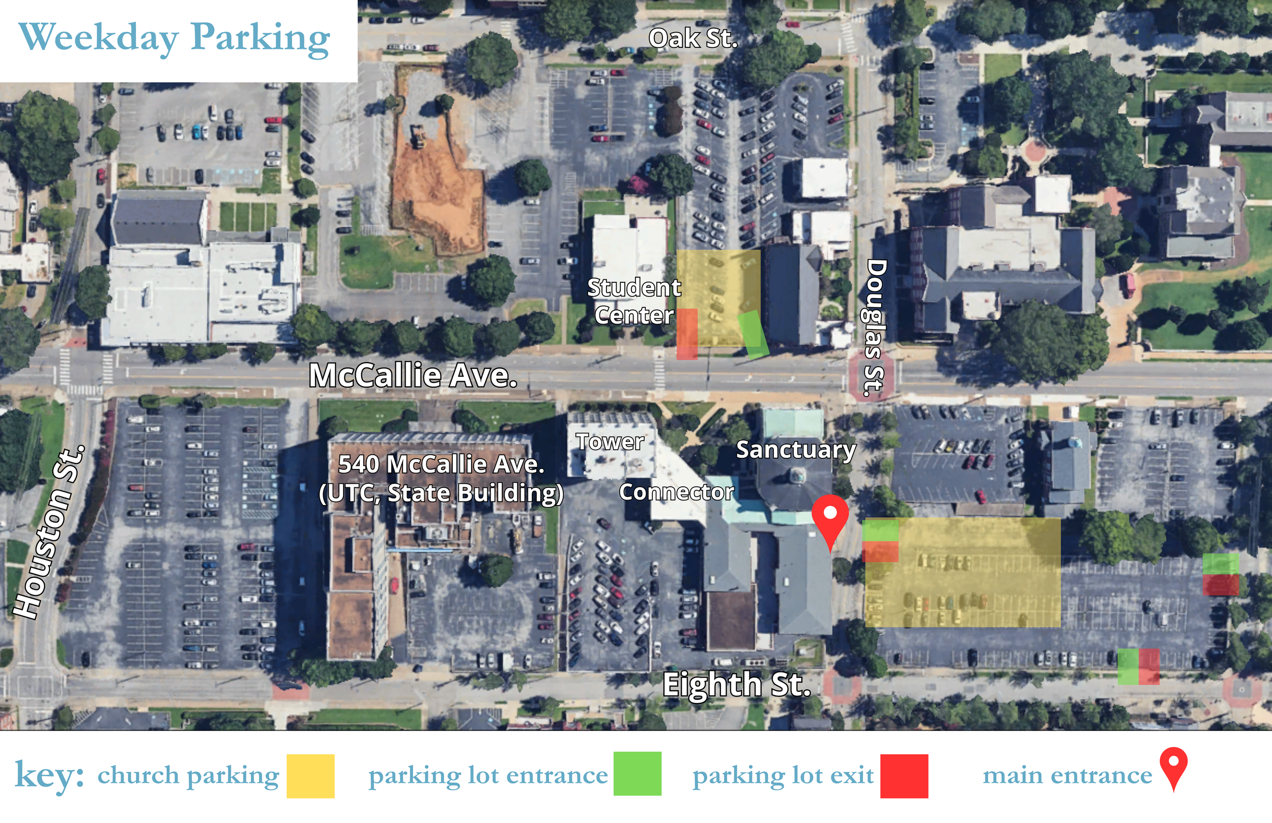 note that Mondays - Fridays between 8am & 5pm, church parking only available in clearly-marked “church reserved” spaces