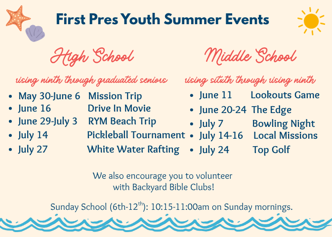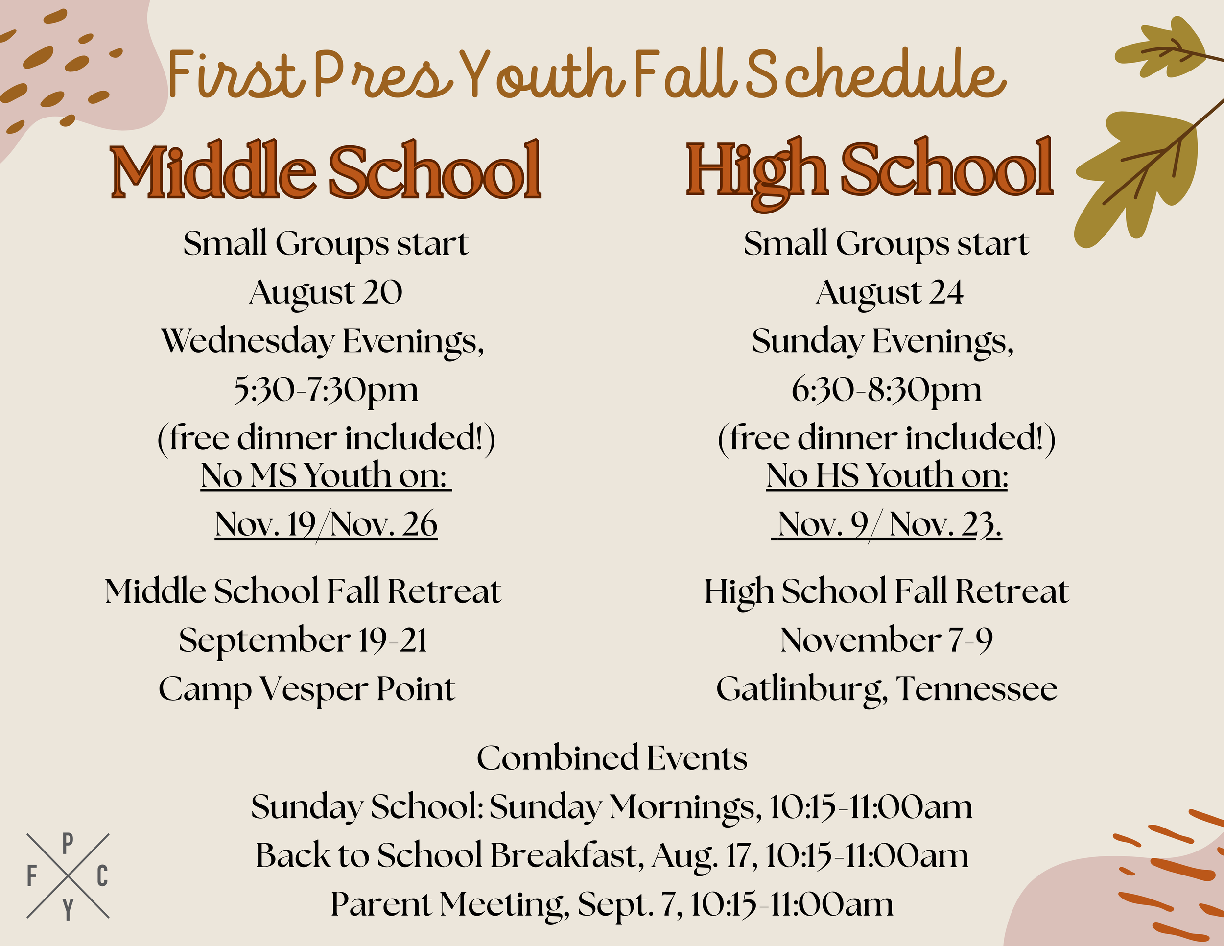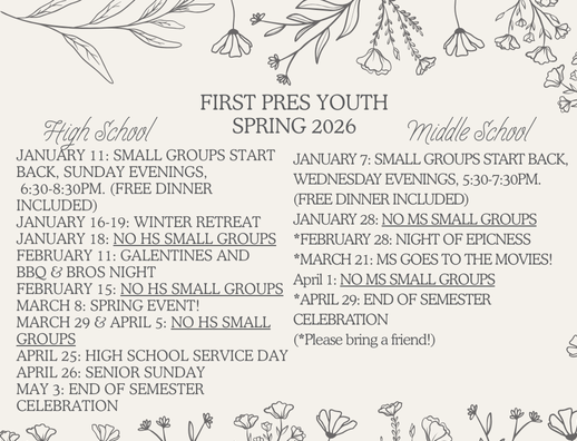 Covenant-Driven: The Gospel calls us into participation and membership of a covenant community in God's Kingdom. We strive to gather and disciple every student and family who are members of our local congregation, encouraging intergenerational connection and active participation in the life of First Pres.